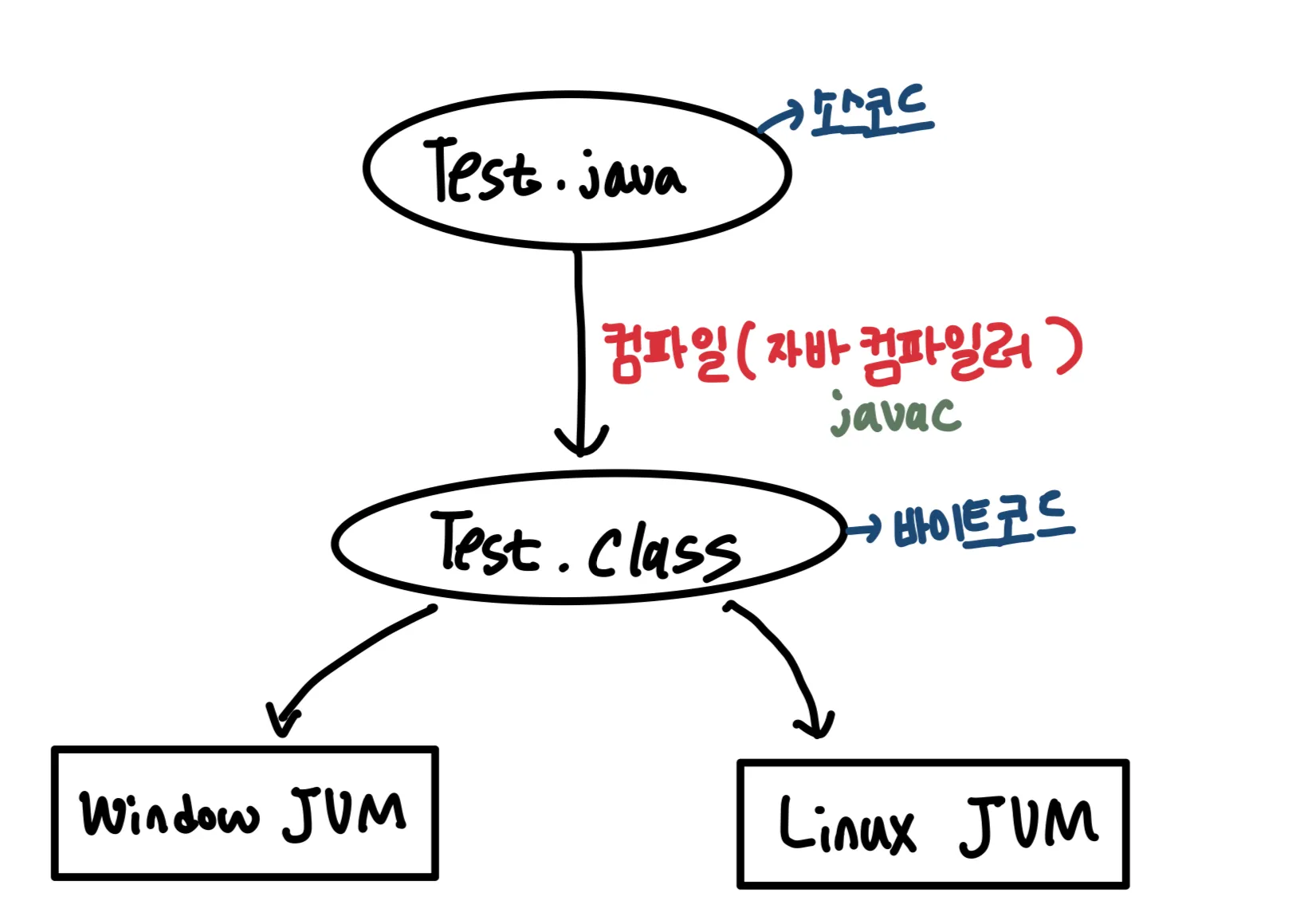 하지만 Java는 운영체제 환경과 상관 없이 통합된 자바 컴파일러를 사용할 수 있다. 윈도우, 리눅스와 같은 서로 다른 운영체제여도 컴파일을 할 때는 동일한 하나의 자바 컴파일러를 이용해서 자바코드(Test.java)를 바이트 코드(Test.class)로 컴파일한다.